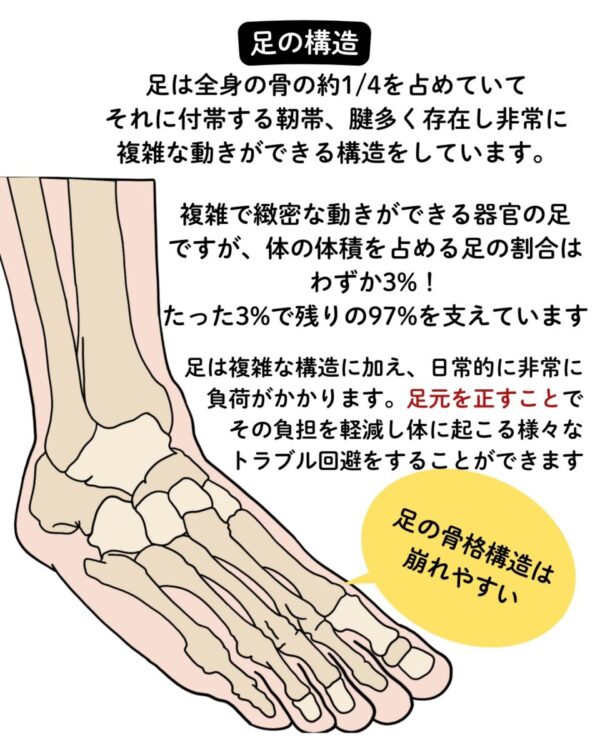 足には私たちの想像以上に日常的に高い負担がかかっており、繊細で複雑な構造をしています。足もとを正すことによりその負担を軽減し、体に起こる様々なトラブルを回避することができます。